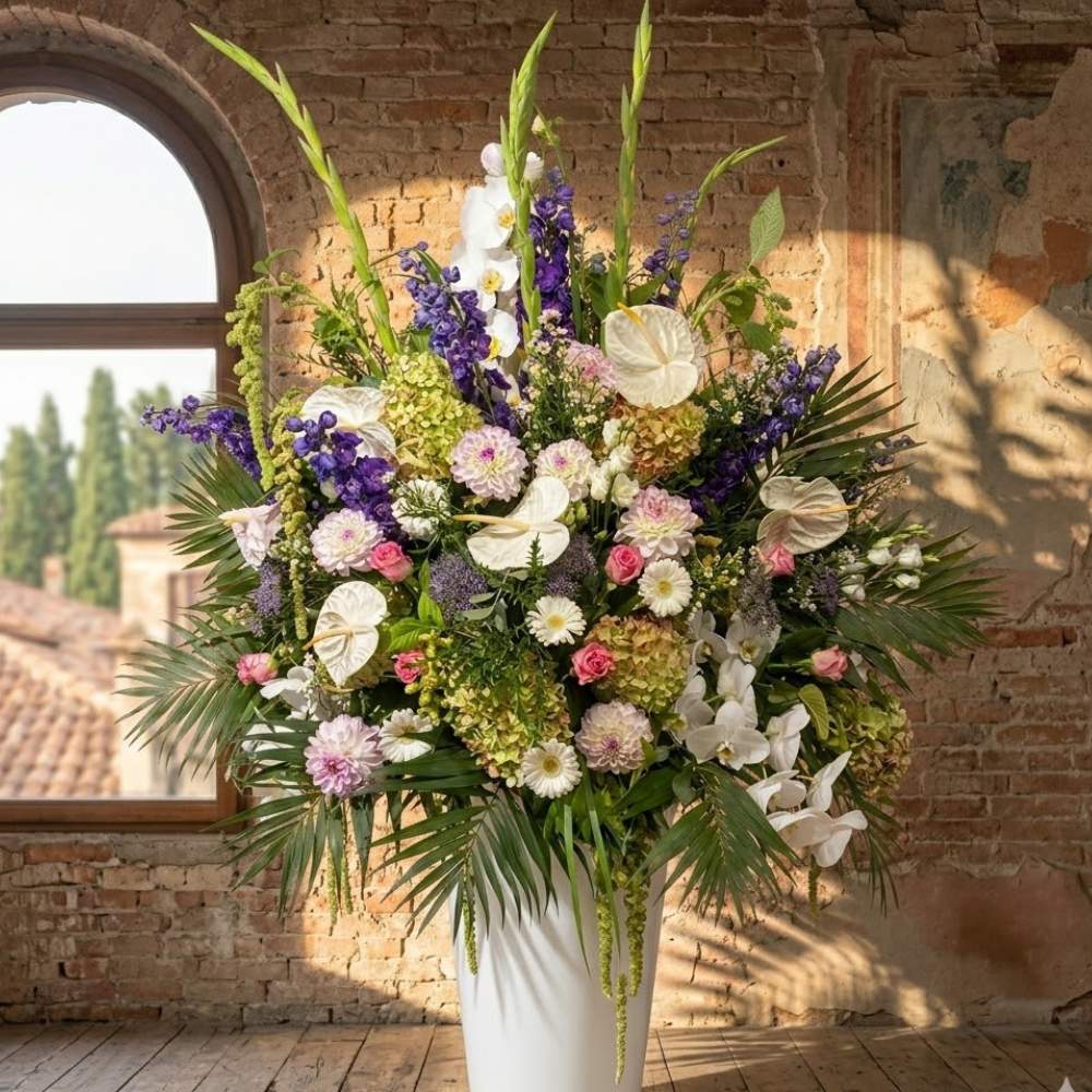 Breng de zonovergoten elegantie van Italië in huis met dit meesterlijke bloemstuk. Geïnspireerd op de serene rust van een Toscaans landgoed, is dit arrangement een weelderige compositie van premium bloemen.